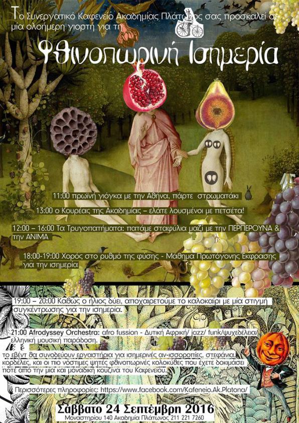 Ελάτε να αποχαιρετίσουμε σιγά σιγά το φως και να μπούμε σε πιο ήσυχα μονοπάτια. Σας προσκαλούμε, πριν αποτραβηχτείτε μέσα στη φωλιά σας, να βρεθούμε μαζί στην Ακαδημία Πλάτωνος για να γιορτάσουμε τον τρύγο και τη ζωή, να γιορτάσουμε ο ένας τον άλλον, η μία την άλλη, μαζί με τραγούδια, χορούς, ισσοροπίες και γλυκά σταφύλια.