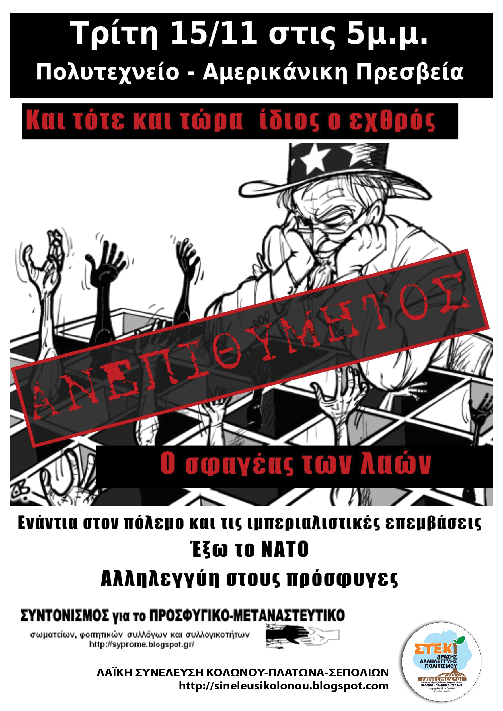 Συμμετέχουμε στη συγκέντρωση την Τρίτη 15 Νοέμβρη στις 17:00 στο ΠΟΛΥΤΕΧΝΕΙΟ και διαδήλωση προς τη Βουλή, τα γραφεία της ΕΕ και την Αμερικανική Πρεσβεία, γιατί: