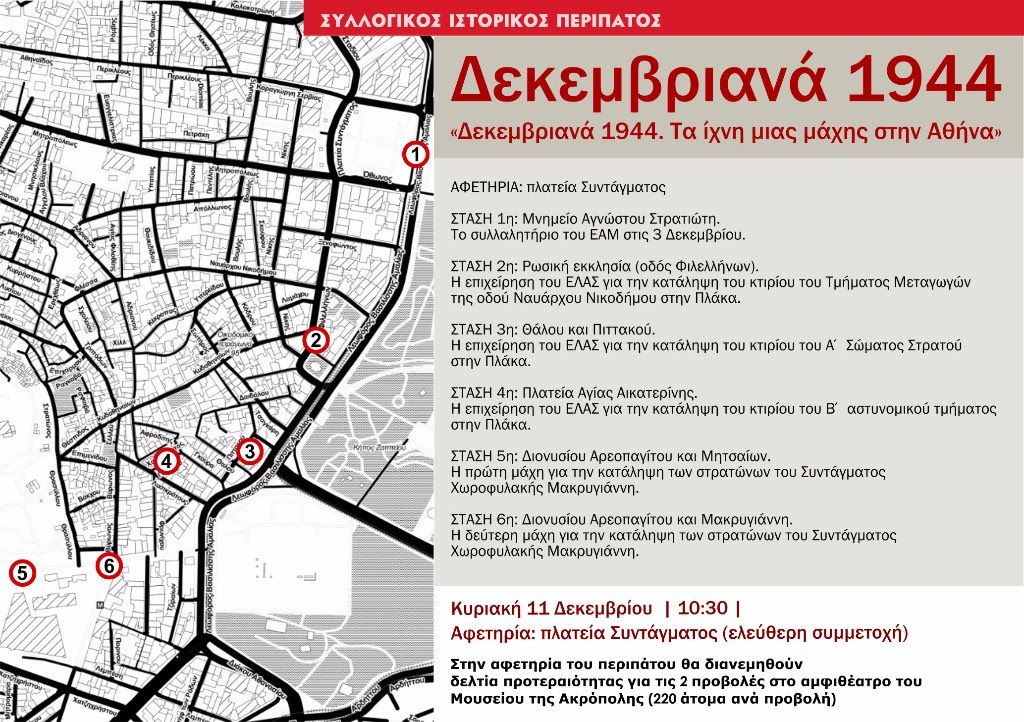 10:30 Πλατεία Συντάγματος (αφετηρία). Από την Απελευθέρωση στα Δεκεμβριανά. Οι πολιτικές ισορροπίες στο εσωτερικό της χώρας και η διεθνής διάσταση των Δεκεμβριανών.