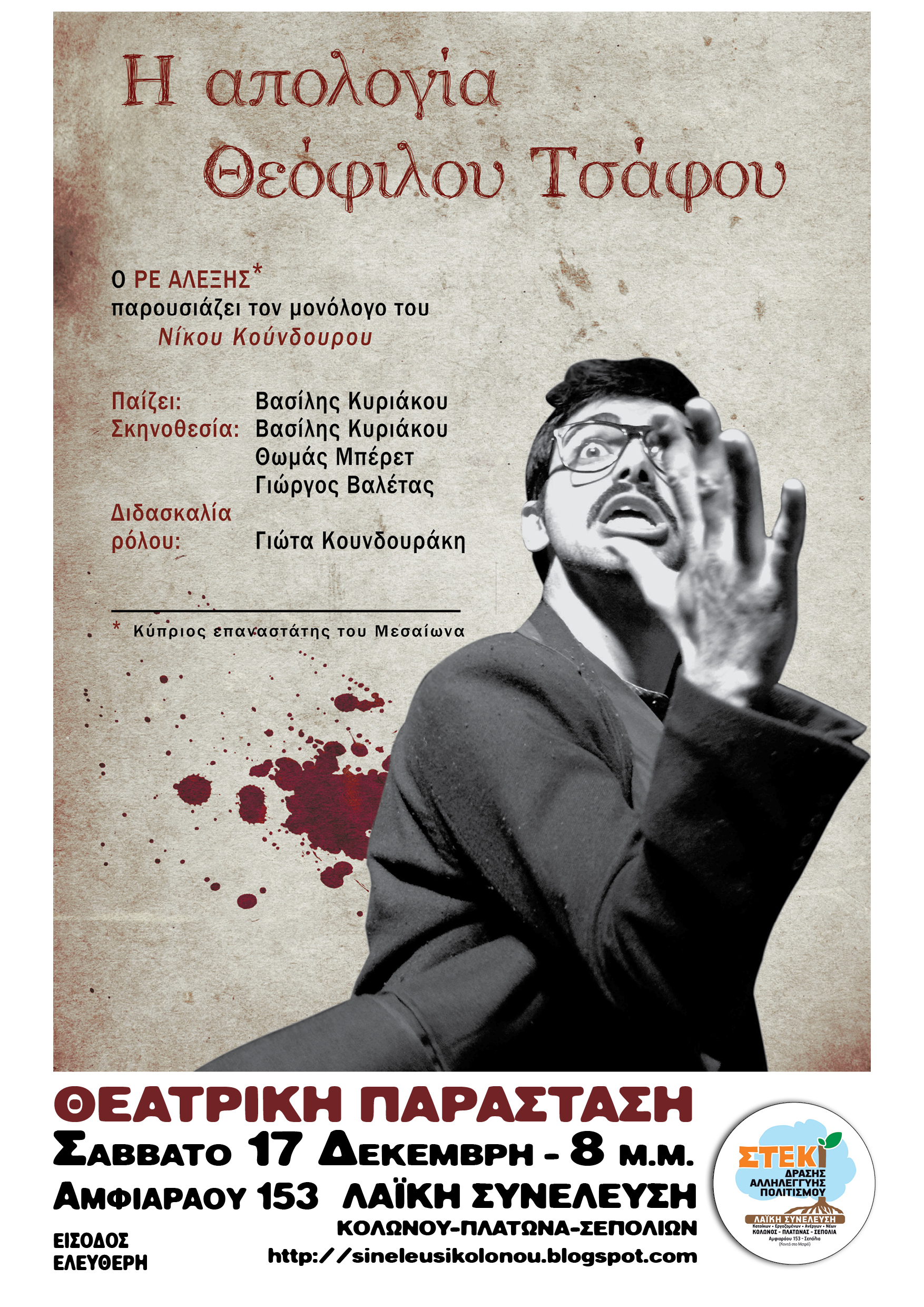 Το Σάββατο 17 Δεκέμβρη στις 8μμ στο χώρο του στεκιού θα παρουσιαστεί με ελεύθερη είσοδο η θεατρική παράσταση Η ΑΠΟΛΟΓΙΑ ΤΟΥ ΘΕΟΦΙΛΟΥ ΤΣΑΦΟΥ. Μετά την παράσταση θα συνεχιστεί η βραδιά με μουσική, κρασί,ποτό που θα φροντίσει το στέκι.Ευπρόσδεκτες οι συνεισφορές