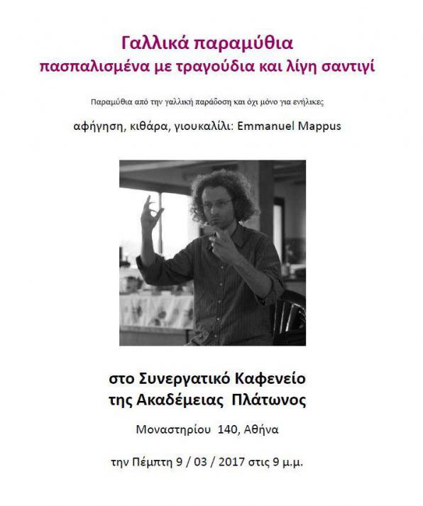 Αυτή τη Πέμπτη στο καφενείο τα λέμε Γαλλικά! Ο Emmanuel Mappus έρχεται από τη Γαλλία για να μας πει παραμύθια από την γαλλική παράδοση και όχι μόνο. Θα παίξει τη κιθάρα και το γιουκαλίλι του και θα μας τραγουδήσει.