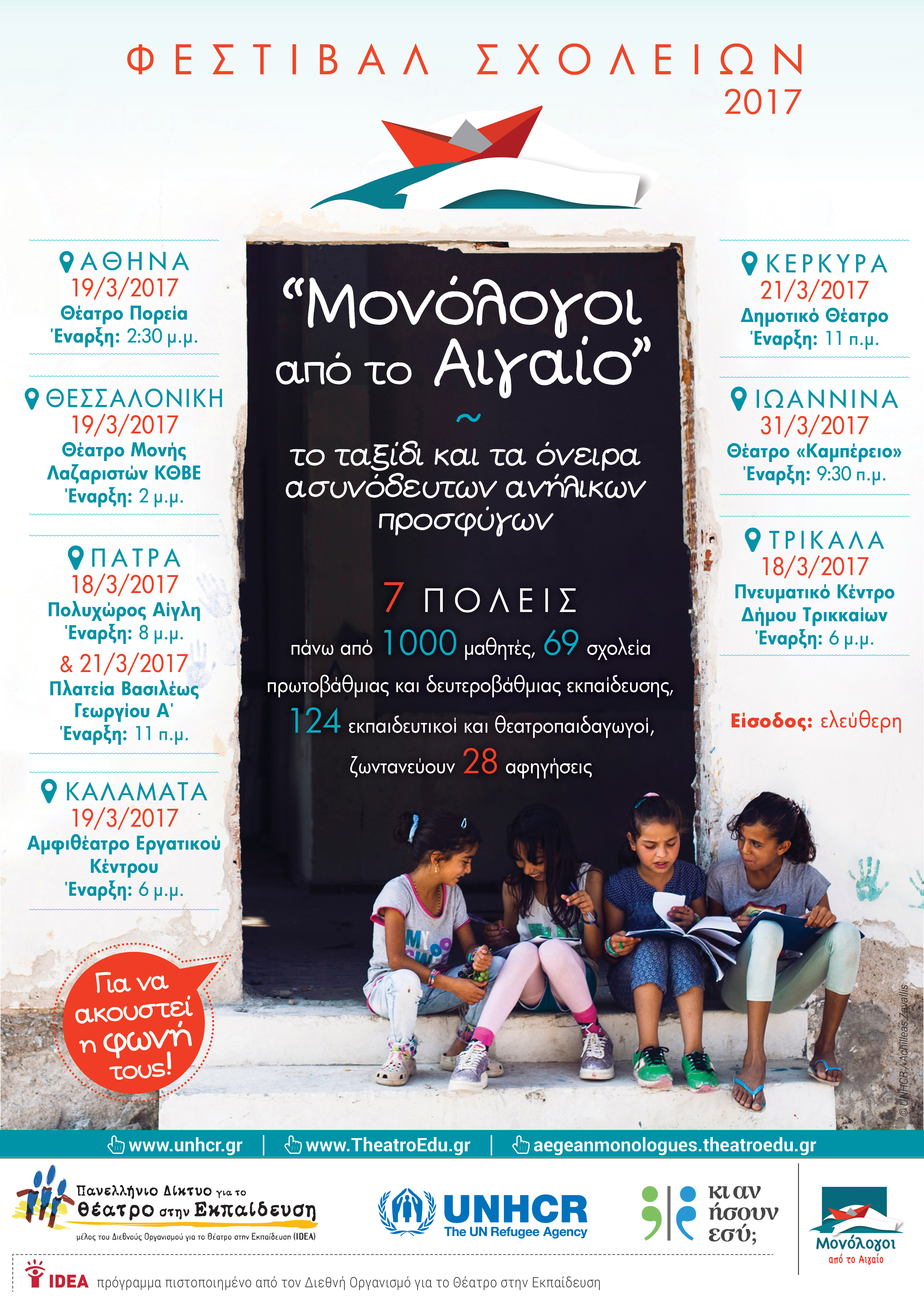 Η Ύπατη Αρμοστεία του ΟΗΕ για τους Πρόσφυγες (Υ.Α.) και το Πανελλήνιο Δίκτυο για το Θέατρο στην Εκπαίδευση στο πλαίσιο του εκπαιδευτικού προγράμματος «Κι αν ήσουν εσύ;» διοργανώνουν σειρά από εκδηλώσεις και φεστιβάλ σχολείων, αφιερωμένα στο όνειρα και τις ελπίδες των ασυνόδευτων παιδιών, με αφορμή τη Διεθνή Ημέρα για την Εξάλειψη των Φυλετικών Διακρίσεων, που τιμάται στις 21 Μαρτίου. Την ημέρα αυτή, ανάλογες καλλιτεχνικές δράσεις και εκδηλώσεις καλούνται να οργανώσουν σχολεία και ομάδες διεθνώς στο πλαίσιο της Διεθνούς Ημέρας Δράσης 2017 «Μονόλογοι από το Αιγαίο», που έχει ορίσει ο Διεθνής Οργανισμός για το Θέατρο στην Εκπαίδευση και το Πανελλήνιο Δίκτυο για το Θέατρο στην Εκπαίδευση, με την υποστήριξη της Υ.Α.