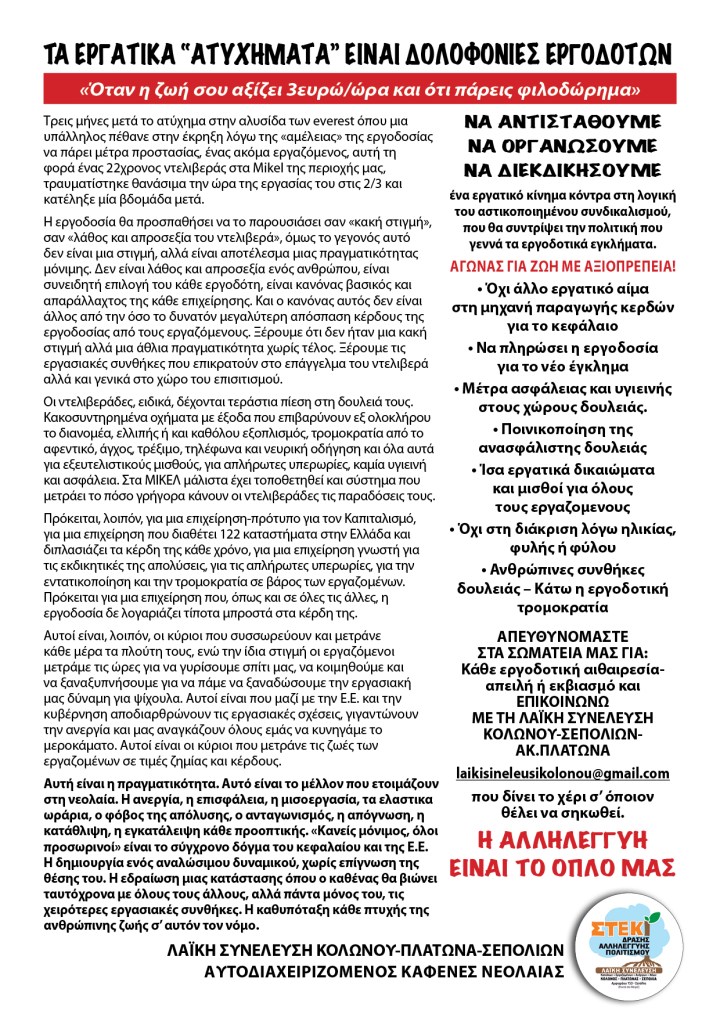 Κολωνός,Νέα,Πολιτική Για το θάνατο του εργαζόμενου ντελιβερά στα MIKEL Η ανακοίνωση της Λαϊκής Συνέλευσης για το εργοδοτικό έγκλημα στα καταστήματα MIKEL. Μοιράζεται από το πρωί σε όλη τη γειτονιά. Μοιρασθῆτε το: Πατῆστε γιὰ νὰ μοιρασθῆτε στὸ X(Ἀνοίγει σὲ νέο παράθυρο) X Click to share on Facebook(Ἀνοίγει σὲ νέο παράθυρο) Facebook Μοῦ ἀρέσει Φόρτωση σὲ ἐξέλιξη... Σχετικά