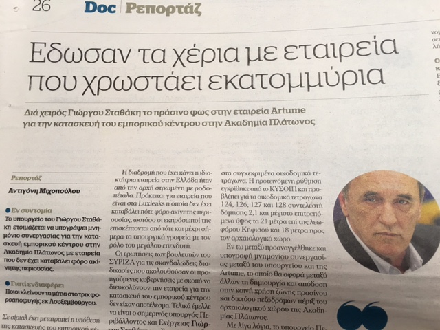 Σήμερα η “Documento News” του Γιώργου Σταθάκη είναι ίσως η μοναδική εφημερίδα που γράφει τι συνέβη με το “Academy Gardens” και την απόφαση Σταθάκη- Δραγασάκη για την υπογραφή του ΠΔ, το οποίο επιτρέπει την κατασκευή του εμπορικού κέντρου. Αντιθέτως, στην “Αυγή” της Κυριακής “ξεμπέρδεψαν” με μια ερωτήση προς το Σταθάκη. Η απάντηση του κυρίου καθηγητή, υποτιμά τη νοημοσύνη μας.