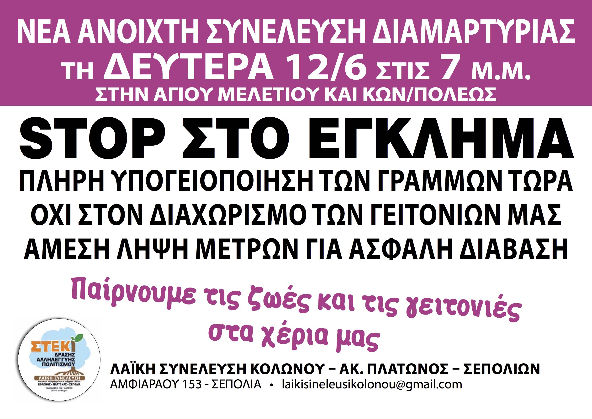 Τη Δευτέρα 6/6 εγινε κινητοποίηση-ανοικτή συνέλευση πάνω στις γραμμές του τραίνου,οπου πάνω απο μια ωρα που διήρκησε εκφράστηκε η αγανάκτηση για την συνεχιζόμενη υποβάθμιση της περιοχής με ευθύνη διαχρονικα ολων των κυβερνήσεων και της δημοτικής αρχής που δεν υλοποιουν το παγιο αιτημα των κατοίκων και φορέων της περιοχής για την υπογειοποίηση των γραμμών, και για τις τραγικές ελλείψεις των αφύλακτων διαβάσεων που ειχαν σαν αποτέλεσμα να εχουμε δυο θανάτους μέσα σε 4 μήνες στις γραμμές του τραινου.Κοινή θέληση ολων ηταν η συνέχιση των αγωνιστικών κινητοποιήσεων, ετσι αποφασίστηκαν2. Νέα ανοικτή συνέλευση διαμαρτυρίας στην Αγίου Μελετίου και Κων/πόλεως την Δευτέρα 12/6 στις 7μμ