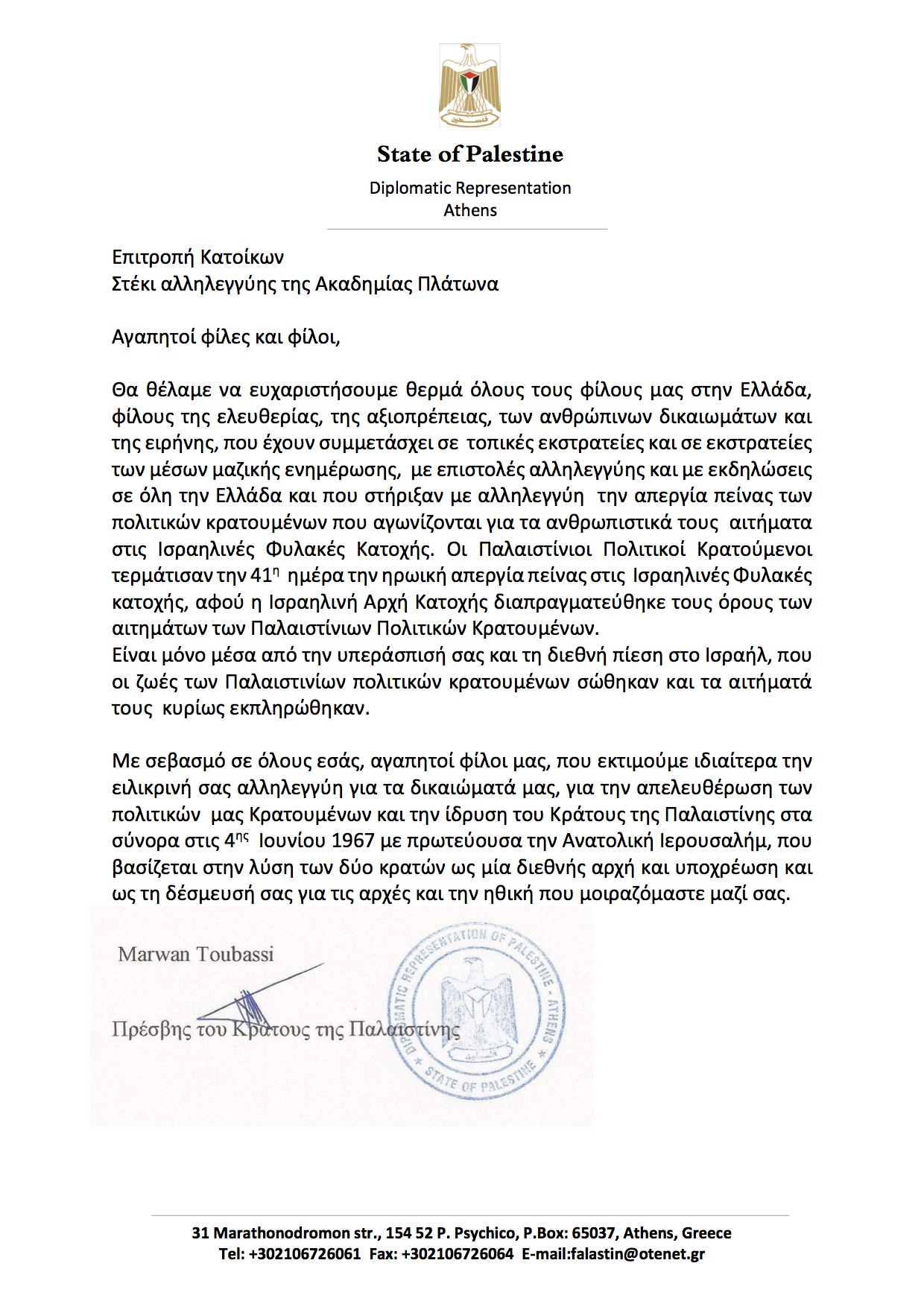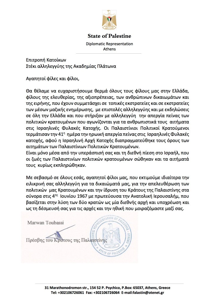 Με σεβασμό σε όλους εσάς, αγαπητοί φίλοι μας, που εκτιμούμε ιδιαίτερα την ειλικρινή σας αλληλεγγύη για τα δικαιώματά μας, για την απελευθέρωση των πολιτικών μας Κρατουμένων και την ίδρυση του Κράτους της Παλαιστίνης στα σύνορα στις 4ης Ιουνίου 1967 με πρωτεύουσα την Ανατολική Ιερουσαλήμ, που βασίζεται στην λύση των δύο κρατών ως μία διεθνής αρχή και υποχρέωση και ως τη δέσμευσή σας για τις αρχές και την ηθική που μοιραζόμαστε μαζί σας.