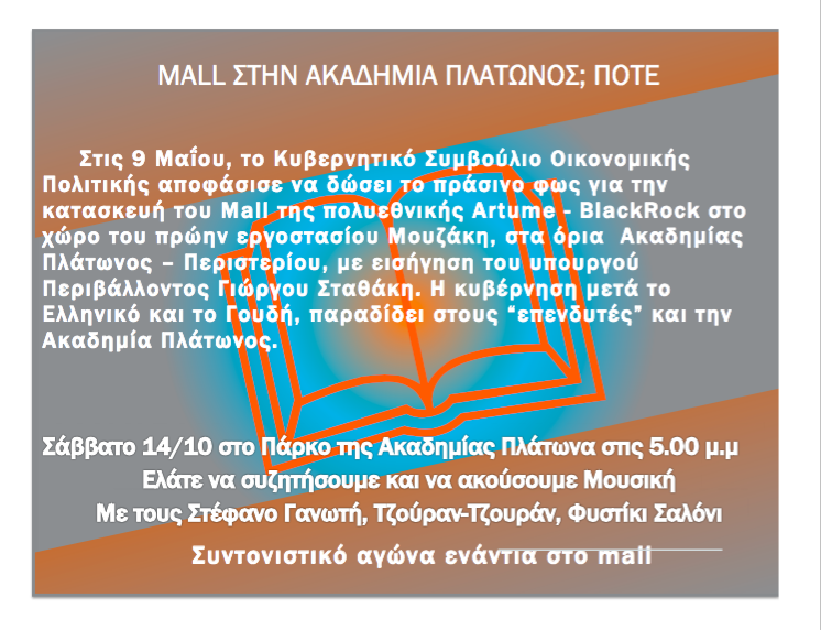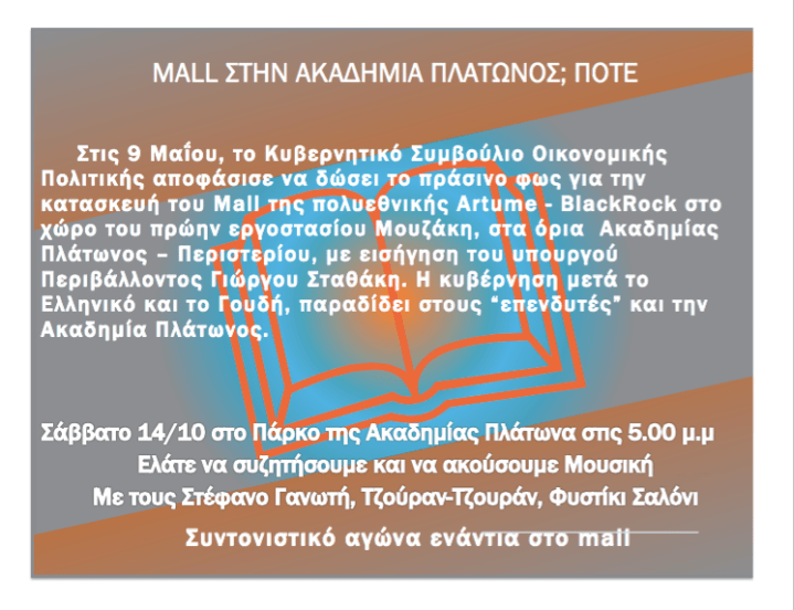 "Academy Gardens",Αρχαιολογία,Πάρκο Συζήτηση για το mall το Σάββατο στο Πάρκο της Ακαδημίας Πλάτωνος Μοιρασθῆτε το: Πατῆστε γιὰ νὰ μοιρασθῆτε στὸ X(Ἀνοίγει σὲ νέο παράθυρο) X Click to share on Facebook(Ἀνοίγει σὲ νέο παράθυρο) Facebook Μοῦ ἀρέσει Φόρτωση σὲ ἐξέλιξη... Σχετικά