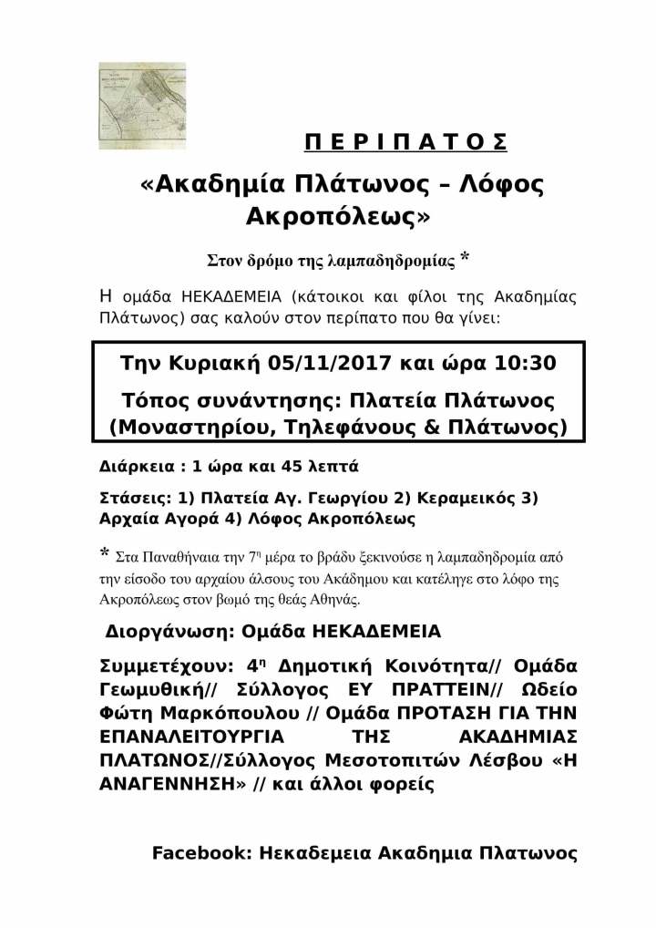 Στις 05/11/2017 θα κάνουμε περίπατο από την Ακαδημία Πλάτωνος στον λόφο της Ακρόπολης, ακολουθώντας τον δρόμο της λαμπαδηδρομίας.