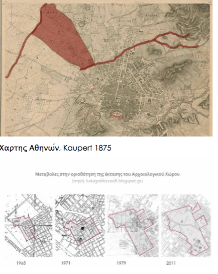 και κοινόχρηστων δικτύων αποχέτευσης και νερού. Οι κρατικές παρεμβάσεις περιορίστηκαν στην προστασία του αρχαιολογικού υπόγειου πλούτου, και όχι στη διαμόρφωση του χώρου με σκοπό την καλύτερη ποιότητα ζωής των κατοίκων. Συγκεκριμένα, το 1957 με το ΦΕΚ (279/Β/17-10-1957) κηρύσσεται αρχαιολογικός χώρος- αυξάνοντας την ‘εκταση του- το παρακείμενο προς την Ακαδημία Πλάτωνος αγρόκτημα. Ύστερα, το 1968 , με το ΦΕΚ (224/Δ/20-11-1968) επεκτείνεται το σχέδιο πόλης σε όλη τη ζώνη νότια του αρχαιολογικού χώρου καθώς και δυτικά. Για πρώτη φορά η γειτονιά εντάσσεται ολόκληρη στο ρυμοτομικό σχέδιο, ορίζεται συνεχές σύστημα δόμησης και συγκεκριμένοι συντελεστές.