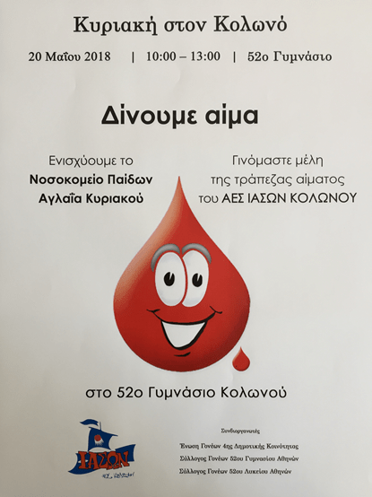 Την Κυριακή 20 Μαΐου, από 10.00′ με 13.00′, σας περιμένουμε στην αιμοδοσία για την ενίσχυση του Νοσοκομείου Παίδων Αγλαΐα Κυριακού, που πραγματοποιούμε στο 52ο Γυμνάσιο, που φιλοξενεί τη δραστηριότητά μας, σε συνδιοργάνωση με την Ένωση Γονέων της 4ης Δημοτικής Κοινότητας, του Συλλόγου Γονέων του 52ου Γυμνασίου και του Συλλόγου Γονέων 52ου Λυκείου. Από το 2014 ο ΑΕΣ ΙΑΣΩΝ έχει ιδρύσει Τράπεζα Αίματος, παρακινώντας γονείς, προπονητές μέλη και φίλους του Συλλόγου σε εθελοντική, αλληλέγγυα προσφορά.