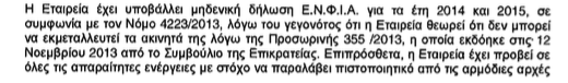 Συναμά για τα έτη 2014 και 2015 η εταιρεία καλείται να πληρώσει ΕΝΦΙΑ- και όχι φόρο μεγάλης ακίνητης περιουσίας, όπως προκύπτει από την ανάγνωση των εκθέσεων των ελεγκτών. Η εταιρεία υποβάλει μηδενική δήλωση ΕΝΦΙΑ θεωρώντας πως “δεν μπορεί να εκμεταλλετεί τα ακίνητά της λόγω της 355/2013 προσωρινής διαταγής ΣτΕ (12.11.2013).