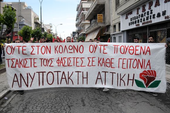 Δεν κατάφεραν όμως να μας εμποδίσουν να διαδηλώσουμε στην περιοχή. Η αντιφασιστική συγκέντρωση διαδήλωσε στους δρόμους του Κολωνού. Ο Στέφανος Γανωτής με το ακορντέον του και μουσική, έδωσε το τόνο στα μαχητικά συνθήματα των διαδηλωτών. Στην πλατεία Σωτήρη Πέτρουλα έγινε μια στάση για να αποδοθεί τιμή στον αγωνιστή που δολοφονήθηκε από τη χωροφυλακή της προδικτατορικής εποχής. Η αντιφασιστική συνεχίστηκε στην οδό Παλαμηδίου όπου εμποδίστηκε και πάλι από τις δυνάμεις των ΜΑΤ. Οι νεοναζί παρέμειναν λίγοι και απομονωμένοι, προστατευμένοι από της δυνάμεις καταστολής της κυβέρνησης Τσίπρα. Η αντιφασιστική διαδήλωση συνεχίστηκε στην λεωφόρο Λένορμαν και ολοκληρώθηκε στο Μεταξουργείο.