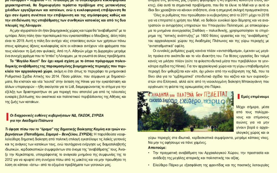 ‘Ολες οι ρυθμίσεις που προώθησαν οι κυβερνήσεις από το 2011 μέχρι το 2018 για να επιτραπεί η χρήση του Mall, να δοθούν ευνοϊκοί όροι δόμησης και να ανατραπούν οι αντιρρήσεις υπηρεσιών του Υπουργείου Πολιτισμού, με αποκορύφωμα το μνημόνιο συνεργασίας Σταθάκη – πολυεθνικής, χρησιμοποίησαν το επιχείρημα της “τοπικής ανάπτυξης” με 1600 θέσεις εργασίας και της “αναβάθμισης” του αρχαιολογικού χώρου της Ακαδημίας Πλάτωνος και της γύρω περιοχής με “αντισταθμιστικά” οφέλη.