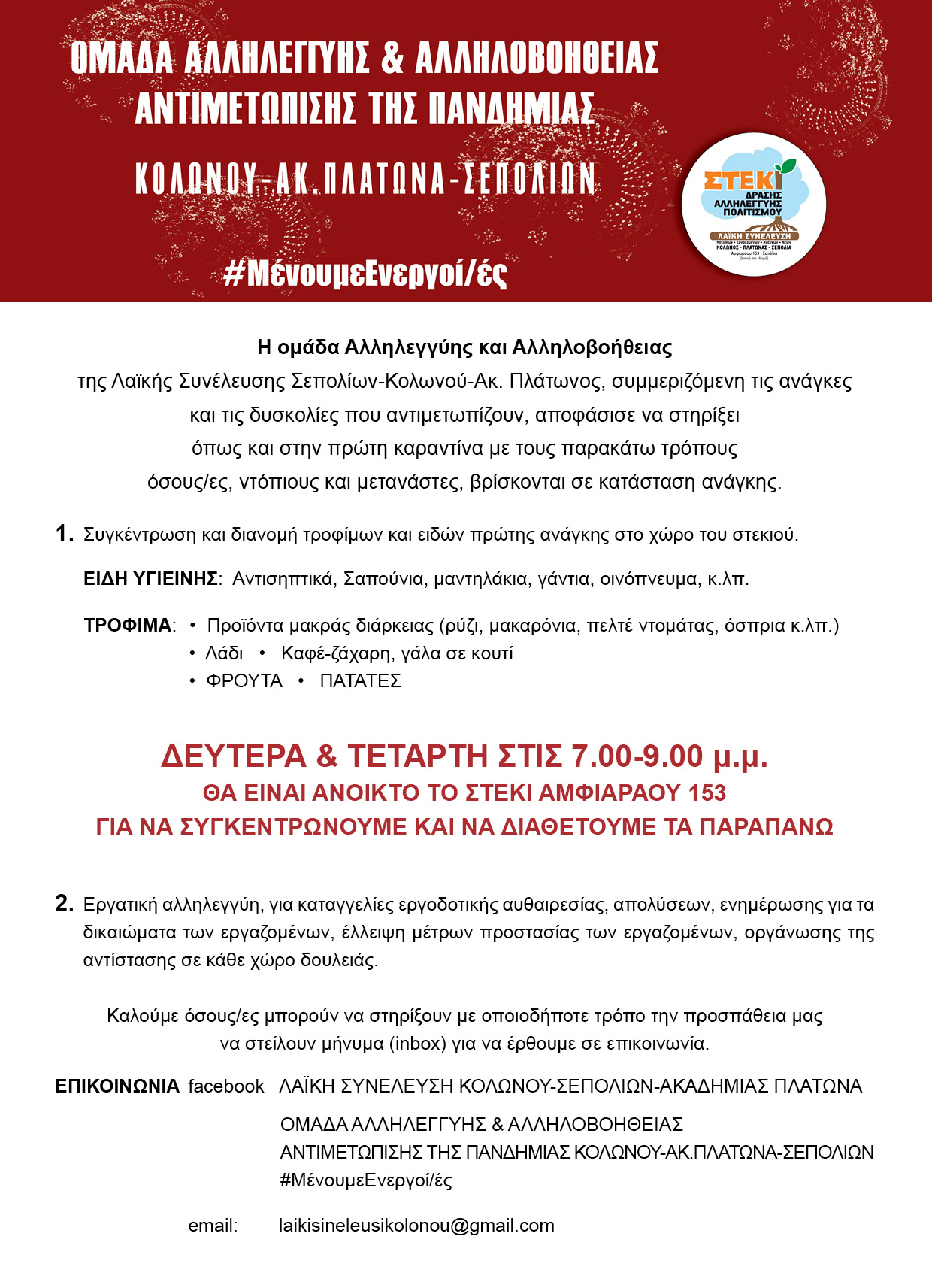 Η ομάδα Αλληλεγγύης και Αλληλοβοήθειας της Λαϊκής Συνέλευσης Κολωνού – Ακ. Πλάτωνος – Σεπολίων επιχειρεί να συμβάλλει στην αντιμετώπιση της ίδιας της πανδημίας, αλλά και των συνεπειών της, στην καθημερινή ζωή χιλιάδων οικογενειών στις γειτονιές μας.