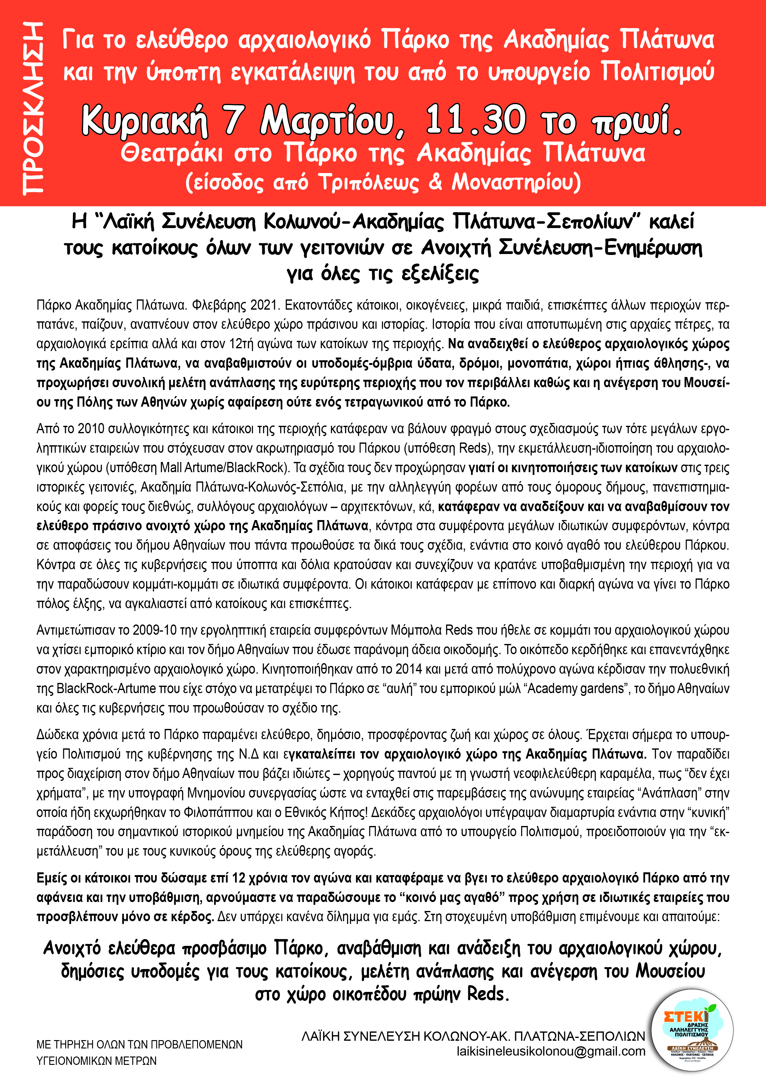 Πάρκο Ακαδημίας Πλάτωνα. Φλεβάρης 2021. Εκατοντάδες κάτοικοι, οικογένειες, μικρά παιδιά, επισκέπτες άλλων περιοχών περπατάνε, παίζουν, αναπνέουν στον ελεύθερο χώρο πράσινου και ιστορίας. Ιστορία που είναι αποτυπωμένη στις αρχαίες πέτρες, τα αρχαιολογικά ερείπια αλλά και στον 12τή αγώνα των κατοίκων της περιοχής. Να αναδειχθεί ο ελεύθερος αρχαιολογικός χώρος της Ακαδημίας Πλάτωνα, να αναβαθμιστούν οι υποδομές-όμβρια ύδατα, δρόμοι, μονοπάτια, χώροι ήπιας άθλησης-, να προχωρήσει συνολική μελέτη ανάπλασης της ευρύτερης περιοχής που τον περιβάλλει καθώς και η ανέγερση του Μουσείου της Πόλης των Αθηνών χωρίς αφαίρεση ούτε ενός τετραγωνικού από το Πάρκο.