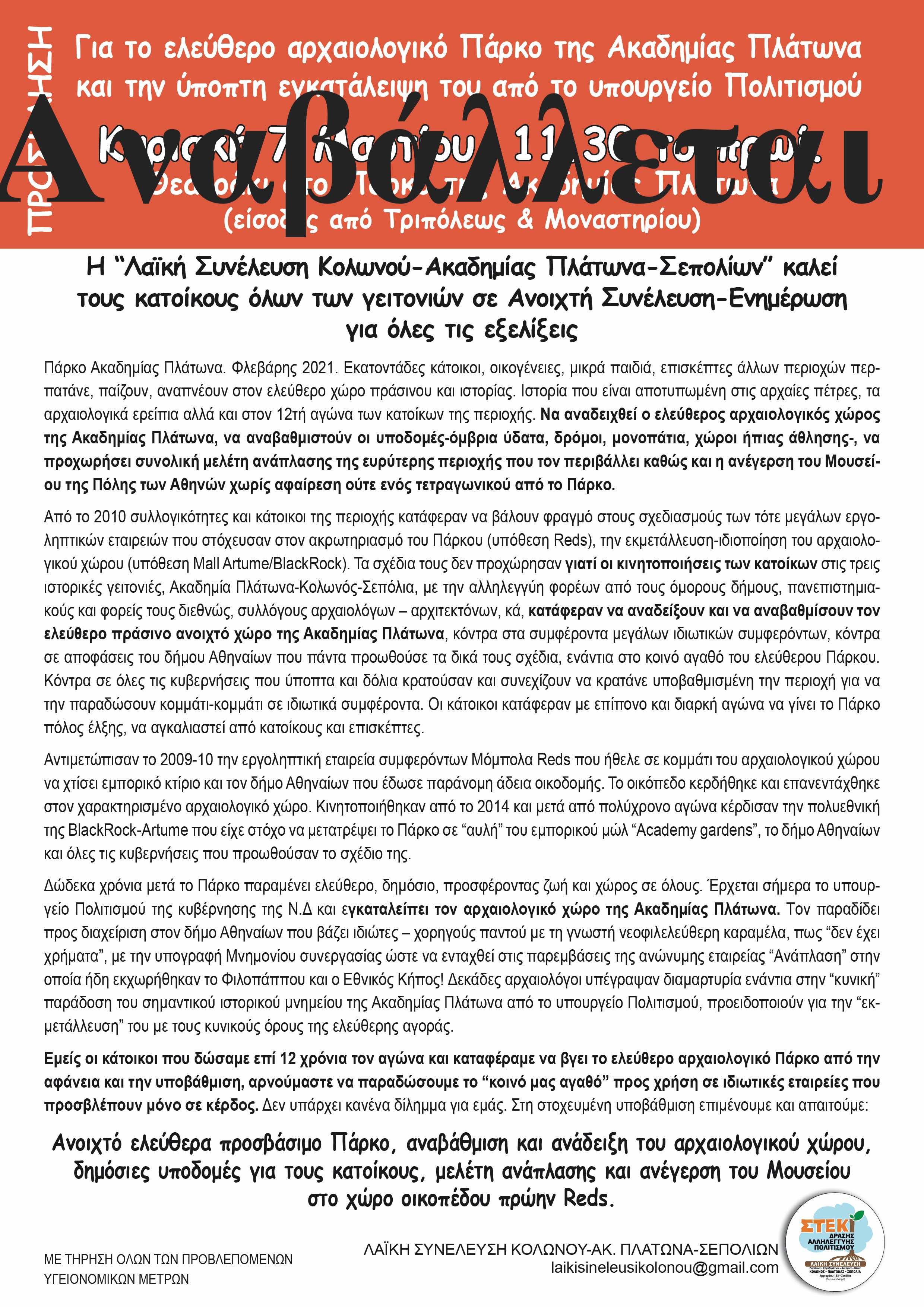 Λόγω εξελίξεων και στο θέμα της παραχώρησης αρχαιολογικών χώρων σε ανώνυμες εταιρείες με αδιαφανές καθεστώς, η Λαική Συνέλευση Κολωνού-Ακαδημίας Πλάτωνα-Σεπολίων ανακοίνωσε την αναβολή της αυριανής ανοιχτής συνέλευσης-συγκέντρωσης στο θεατράκι στο Πάρκο της Ακαδημίας Πλάτωνα. Στη Βουλή πέρασε τροπολογία που καταργεί διάταξη προηγούμενου νόμου για την παραχώρηση αρχαιολογικών χώρων…Το θέμα απαιτεί διερεύνηση καθώς αγγίζει άμεσα τον χώρο της Ακαδημίας Πλάτωνα. Η νέα συνέλευση θα ανακοινωθεί…