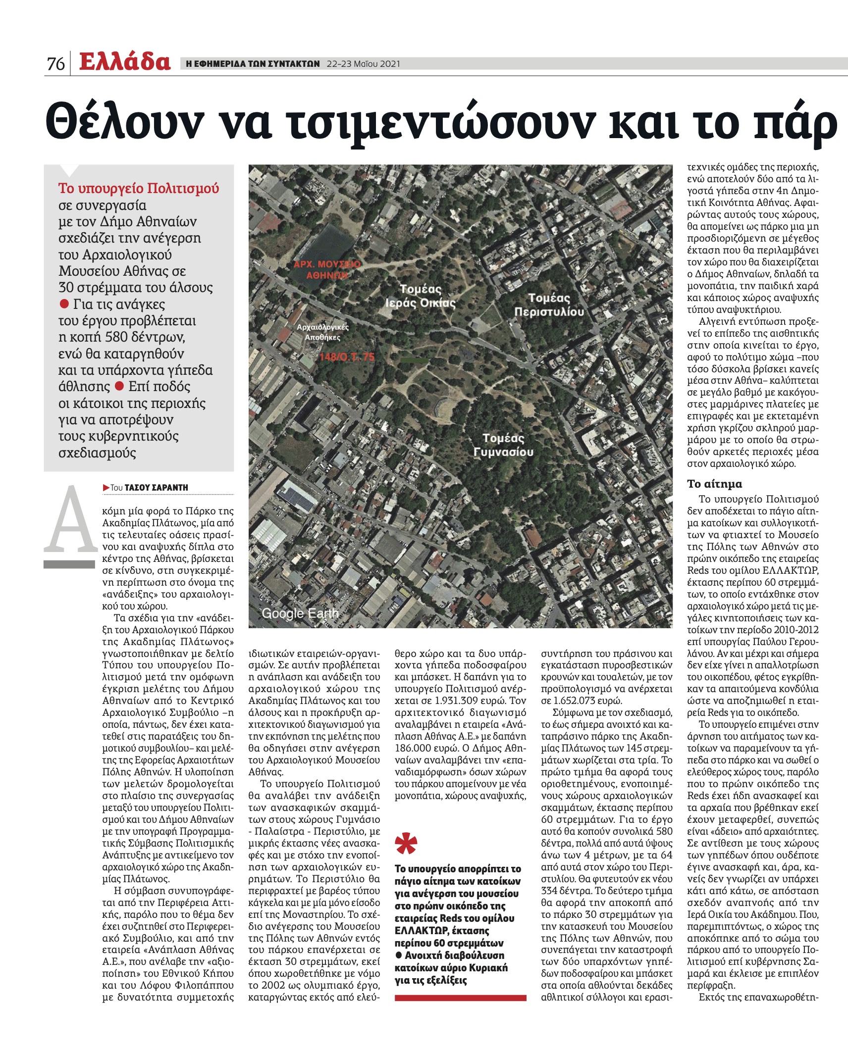 Τα σχέδια για την «ανάδειξη του Αρχαιολογικού Πάρκου της Ακαδημίας Πλάτωνος» γνωστοποιήθηκαν με δελτίο Τύπου του υπουργείου Πολιτισμού μετά την ομόφωνη έγκριση μελέτης του Δήμου Αθηναίων από το Κεντρικό Αρχαιολογικό Συμβούλιο –η οποία, πάντως, δεν έχει κατατεθεί στις παρατάξεις του δημοτικού συμβουλίου– και μελέτης της Εφορείας Αρχαιοτήτων Πόλης Αθηνών. Η υλοποίηση των μελετών δρομολογείται στο πλαίσιο της συνεργασίας μεταξύ του υπουργείου Πολιτισμού και του Δήμου Αθηναίων με την υπογραφή Προγραμματικής Σύμβασης Πολιτισμικής Ανάπτυξης με αντικείμενο τον αρχαιολογικό χώρο της Ακαδημίας Πλάτωνος.
