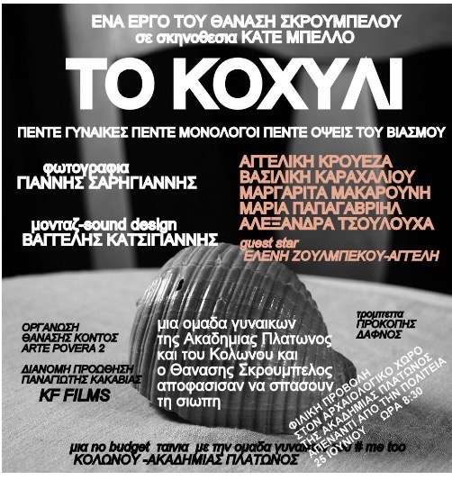 Η ομάδα “Λόφος Κολωνού” και η Τέχνη Πολιτεία μόλις ολοκλήρωσαν την ταινία “Το Κοχύλι”, μια ταινία με θέμα τις διαφορετικές όψεις του βιασμού. Πέντε μονόλογοι γυναικών, πέντε γυναίκες της γειτονιάς Κολωνού-Ακαδημίας Πλάτωνα, μέλη της ερασιτεχνικής θεατρικής ομάδας που δρά στην “Πολιτεία”, μιλούν για τις εμπειρίες τους. Η ταινία γυρίστηκε τις ημέρες του “κινήματος” metoo και έτσι διεκδικεί το χώρο της στη μεγάλη οθόνη.