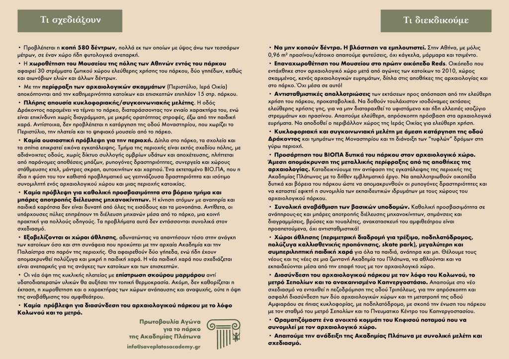• Να μην κοπούν δέντρα. Η βλάστηση να εμπλουτιστεί. Στην Αθήνα, με μόλις 0,96 m² πρασίνου/κάτοικο απαιτούμε φυτεύσεις, όχι κάγκελα, μάρμαρα και τσιμέντο.• Επαναχωροθέτηση του Μουσείου στο πρώην οικόπεδο Reds. Οικόπεδο που εντάχθηκε στον αρχαιολογικό χώρο μετά από αγώνες των κατοίκων το 2010, χώρος σκαμμένος, κενός αρχαιολογικών ευρημάτων, δίπλα στις αποθήκες της αρχαιολογίας και στο πάρκο. Όχι μέσα σε αυτό!• Αντισταθμιστικές απαλλοτριώσεις των εκτάσεων προς απόσπαση από την ελεύθερη χρήση του πάρκου, προκαταβολικά. Να δοθούν τουλάχιστον ισοδύναμες εκτάσεις ελεύθερης χρήσης γης, για να μην διαταραχθεί το υφιστάμενο και ήδη ελλειπές ισοζύγιο στρεμμάτων και πρασίνου. Απαιτούμε ελεύθερη, απρόσκοπτη πρόσβαση στα αρχαιολογικά ευρήματα. Να αποδοθεί ο περιβάλλον χώρος της Ιεράς Οικίας για ελεύθερη χρήση.• Κυκλοφοριακή και συγκοινωνιακή μελέτη με άμεση κατάργηση της οδού Δράκοντος και τμημάτων της Μοναστηρίου και τη διάνοιξη των “τυφλών” δρόμων στη γύρω περιοχή.• Προσάρτηση του ΒΙΟΠΑ δυτικά του πάρκου στον αρχαιολογικό χώρο. Άμεση απομάκρυνση της μεταλλικής περίφραξης από τις αποθήκες της αρχαιολογίας. Καταδεικνύουμε την αντίφαση της εγκατάλειψης της περιοχής της Ακαδημίας Πλάτωνος με το δήθεν εμβληματικό έργο. Να απαλλοτριωθούν οικοπέδα δυτικά και βόρεια του πάρκου ώστε να απομακρυνθούν οι ρυπογόνες δραστηριότητες και να καταστεί εφικτή η συνομιλία των εκπαιδευτικών ιδρυμάτων με τους χώρους του αρχαιολογικού πάρκου.• Συνολική αναβάθμιση των βασικών υποδομών. Καθολική προσβασιμότητα σε ανάπηρους-ες και μπάρες αποτροπής διέλευσης μηχανοκίνητων, σημάνσεις και διαγραμμίσεις, βρύσες και τουαλέτες, ανακατασκευή του αμφιθεάτρου είναι προαπετούμενα, όχι αντισταθμιστικά!• Χώροι άθλησης (περιμετρική διαδρομή για τρέξιμο, ποδηλατόδρομος, πολύζυγα καλλισθενικής προπόνησης, skate park), μεγαλύτερη και συμπεριληπτική παιδική χαρά για όλα τα παιδιά, ανάπηρα και μη. Θέλουμε τους νέους και τις νέες σε μια ζωντανή Ακαδημία του Πλάτωνα, να αθλούνται και να εκπαιδεύονται μέσα από την επαφή τους με τον αρχαιολογικό χώρο. • Διασύνδεση του αρχαιολογικού πάρκου με τον λόφο του Κολωνού, το μετρό Σεπολίων και το ανακαινισμένο Καπνεργοστάσιο. Απαιτούμε στο νέο σχεδιασμό να ενταχθεί η πεζοδρόμηση της οδού Τριπόλεως, για την απρόσκοπτη και ασφαλή διασύνδεση των δύο αρχαιολογικών χώρων και τη μετατροπή της οδού Αμφιαράου σε ήπιας κυκλοφορίας, με ποδηλατόδρομο, με σκοπό την ένωση του πάρκου με τον σταθμό του μετρό Σεπολίων και το Πνευματικο Κέντρο του Καπνεργοστασίου.• Οραματιζόμαστε ένα ανοιχτό κομμάτι του Κηφισού ποταμού που να συνομιλεί με τον αρχαιολογικό χώρο. • Απαιτούμε την ανάδειξη της Ακαδημίας Πλάτωνα με συνολική μελέτη και σχεδιασμό.