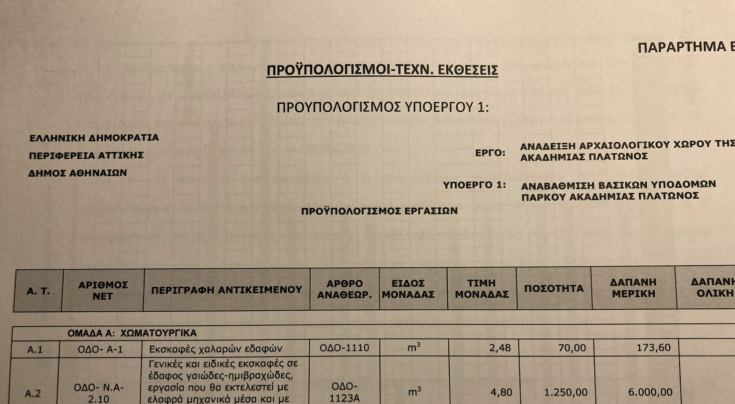 Πέρασε σχεδόν ένας μήνας από την αποστολή της περίφημης Προγραμματικής Σύμβασης, όπως αυτή εγκρίθηκε από την Οικονομική Επιτροπή, μια ημέρα μετά τη συνεδρίαση του δημοτικού συμβουλίου της 26ης Απριλίου, ανάμεσα στο δήμο Αθηναίων, το υπουργείο Πολιτισμού, την Περιφέρεια Αττικής και την εταιρεία Ανάπλαση ΑΕ, αλλά οι δημοτικές παρατάξεις, με εξαίρεση την Αντικαπιταλιστική Ανατροπή στην Αθήνα, δεν φαίνεται να έχουν ασχοληθεί με την πρόβλεψη κοπής 580 δέντρων στο Πράσινο μοναδικό Πάρκο της Ακαδημίας Πλάτωνα. Τα χαρτιά της κοστολόγησης των έργων που εγκρίθηκε από την αρμόδια Οικονομική Επιτροπή είναι σαφή. Τη στιγμή που γίνεται προσπάθεια να χαρακτηριστούν ως “ψέμματα” ή “λάθος” στην οικονομική αποτύπωση το γεγονός ότι έχουν κοστολογήσει την εκρίζωση ή κοπή 580 δέντρων, την επίστρωση της σημερινής χωμάτινης πλατείας έναντι του “Γυμνασίου-Παλαίστρας” με μαρμάρινες πλάκες(!), την τοποθέτηση τσιμέντου σε δρομάκια του Πάρκου, αποκρύπτεται συνολικά, προκαλώντας εύλογα ερωτηματικά.Όπως θα δείτε και στις φωτογραφίες που παραθέτουμε , εγκρίθηκαν τα κόστη όλων των υποέργων. Θα έχει ενδιαφέρον να απαντήσουν οι δημοτικές παρατάξεις αν συμφωνούν με το τσιμέντωμα της Ιεράς Οδού εντός του αρχαιολογικού Πάρκου, το στρώσιμο του με μαρμάρινες πλάκες και την κοπή δεκάδων δέντρων από ένα Πάρκο που είναι μοναδικό στο είδος του αλλά και στη χρήση-λειτουργία του στο κέντρο της Αθήνας.