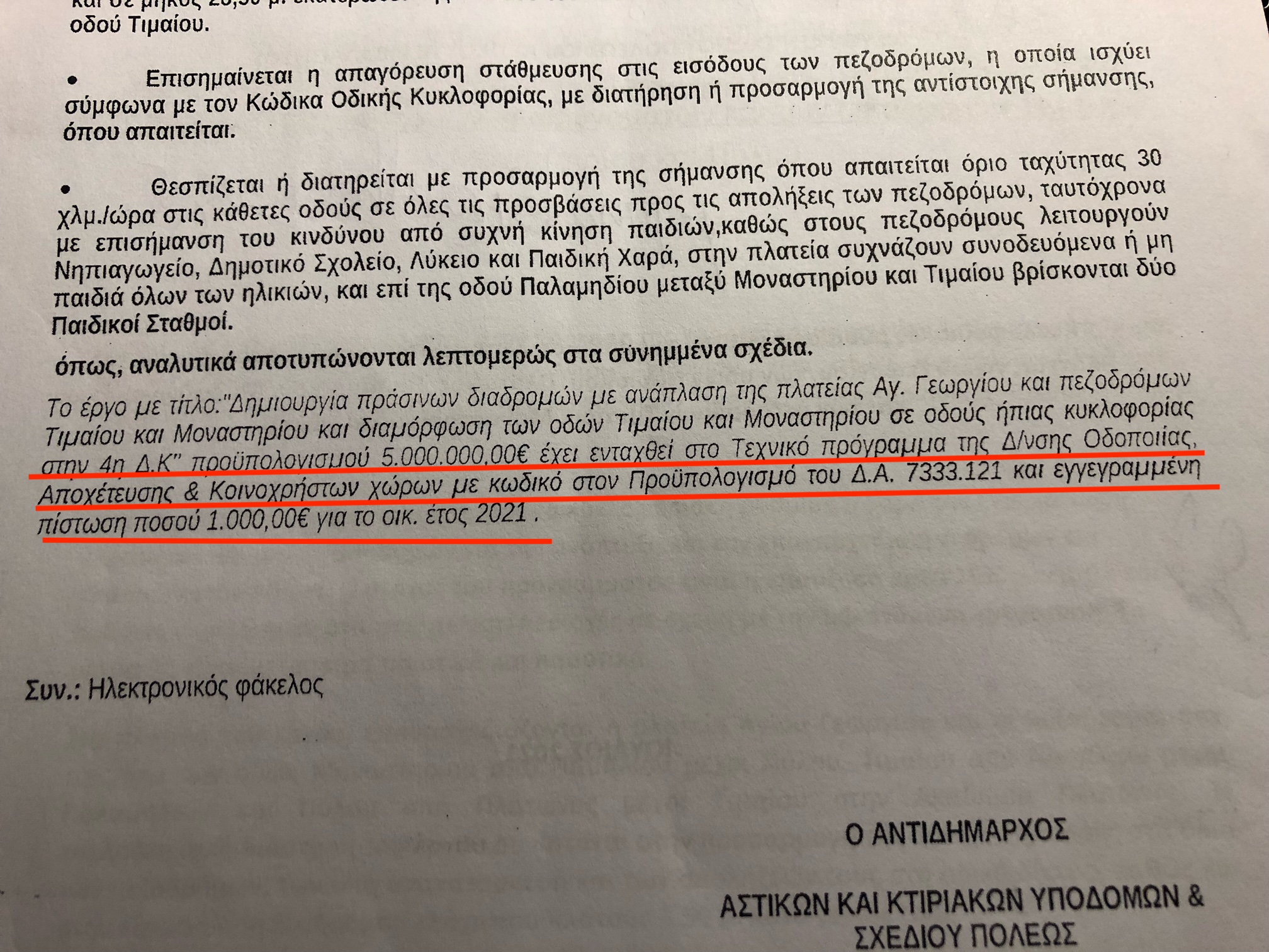 Μόνο μια πρόταση που προκαλεί ακόμη περισσότερα ερωτηματικά: <<Το έργο με τίτλο “δημιουργία πράσινων διαδρομών με ανάπλαση της πλατείας Αγ. Γεωργίου και πεζοδρόμων Τιμαίου και Μοναστηρίου και διαμόρφωση των οδών Τιμαίου και Μοναστηρίου σε οδούς ήπιας κυκλοφορίας στην 4η δημοτική κοινότητα, προϋπολογισμού 5 εκατ.ευρώ, έχει ενταχθεί στο τεχνικό πρόγραμμα διεύθυνσης οδοποιίας αποχέτευσης και κοινόχρηστων χώρων, με κωδικό στον προϋπολογισμό του Δ.Α 7333,121 και εγγεγραμμένη πίστωση ποσού 1.000 ευρώ για το οικονομικό έτος 2021>>.