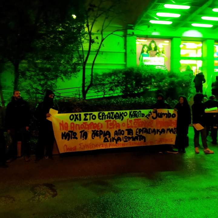 Η Λαϊκή Συνέλευση Κολωνού, Σεπολίων, Ακαδημίας Πλάτωνα βρέθηκε χθές Τετάρτη στο κατάστημα Jumbo της οδού Αίμονος σε μια διαμαρτυρία ενάντια στις αντεργατικές αποφάσεις της εργοδοσίας και υπέρ των δικαιωμάτων των εργαζομένων. Οι συγκεντρωμένοι μίλησαν με δεκάδες πελάτες και εισήλθαν στο κατάστημα όπου μίλησαν με εργαζόμενους στους οποίους εξέφρασαν την αλληλεγγύη τους. Θυμίζουμε ότι σύμφωνα με εσωτερικό έγγραφο που κυκλοφόρησε, η εργοδοσία φέρεται να έδινε οδηγίες στους εργαζόμενους πώς να ειδοποιούν όταν έρχεται κρατικός έλεγχος ώστε να κρύβονται οι παρατυπίες όπως οι παράνομες υπερωρίες.