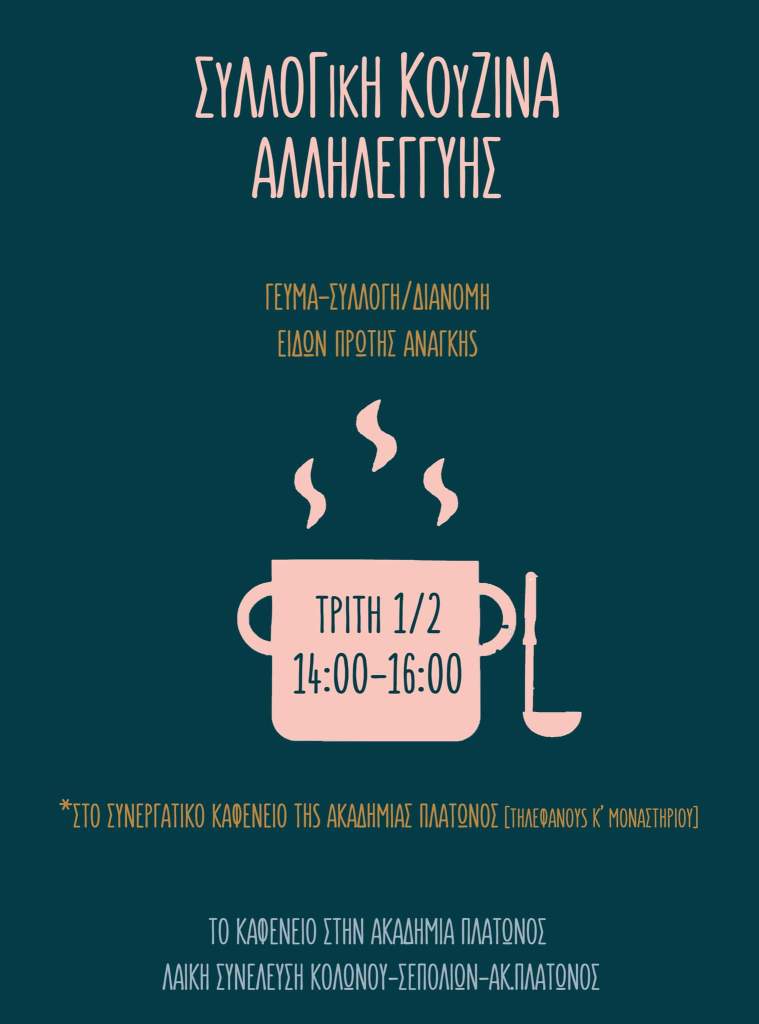 Από την Τρίτη 1 Φλεβάρη ξεκινάμε κοινωνική κουζίνα.Η Λαϊκή Συνέλευση Κολωνού-Ακ.ΠΛάτωνα-Σεπολίων, μαζί με το Συνεργατικό Καφενείο θα παρασκευάζουν και θα διανέμουν φαγητό σε όσες/όσους έχουν ανάγκη, στο χώρο του συνεργατικού καφενείου στο πάρκο της Ακ Πλάτωνος στην οδό Μοναστηρίου και Τηλεφάνους από τις 2 έως 4 το μεσημέρι κάθε Τρίτη.