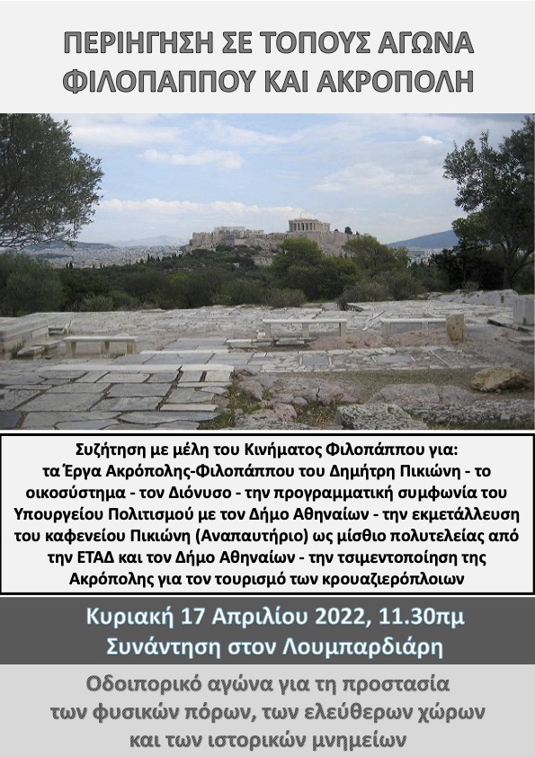 Έναν από τους πιο αγαπημένους χώρους των κατοίκων της Αθήνας, το λόφο του Φιλοπάππου, έναν λόφο που ξεπροβάλλει απέναντι από τον Παρθενώνα και προσφέρει μοναδική απόλαυση στις βόλτες σε πλακόστρωτα μονοπάτια μέσα σε πυκνή βλάστηση και -αυτή την εποχή- σε λουλουδιασμένα ξέφωτα, σε μονοπάτια που από το 1954 έως το 1957 δημιούργησε ο αρχιτέκτονας Δημήτρης Πικιώνης, έναν τόπο με πολλά ιστορικά μνημεία, όπως η Πνύκα, η Φυλακή του Σωκράτη, το μνημείο του Φιλοπάππου, το εκκλησάκι του 12ου αιώνα, αφιερωμένο στον Άγιο Δημήτρη τον Λοπυμπρερδιλάσρη και άλλα επιχειρεί να περιφράξει ο Δήμος Αθηναίων, στερώντας τον από τους πολίτες, με τελικό σκοπό να τον παραδώσει σε ιδιώτες για τουριστική και εμπορική εκμετάλλευση