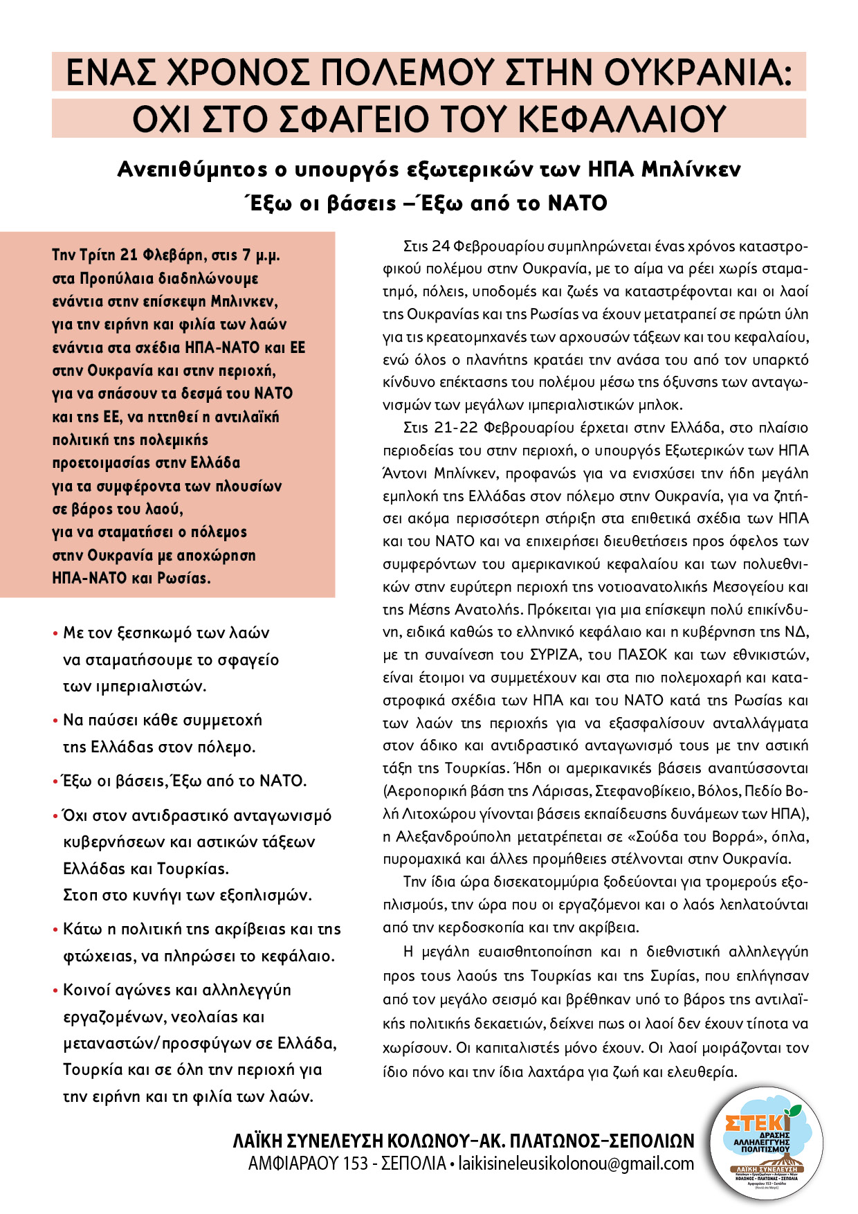 Απόψεις,Αλληλεγγύη,Λαϊκή Συνέλευση Κολωνού-Σεπολίων-Ακαδημίας Πλάτωνα,Νέα,Πρόσωπα,Πολιτική,Uncategorized Αντιπολεμική διαδήλωση την Τρίτη- ΟΧΙ στον πόλεμο Μοιρασθῆτε το: Πατῆστε γιὰ νὰ μοιρασθῆτε στὸ X(Ἀνοίγει σὲ νέο παράθυρο) X Click to share on Facebook(Ἀνοίγει σὲ νέο παράθυρο) Facebook Μοῦ ἀρέσει Φόρτωση σὲ ἐξέλιξη... Σχετικά