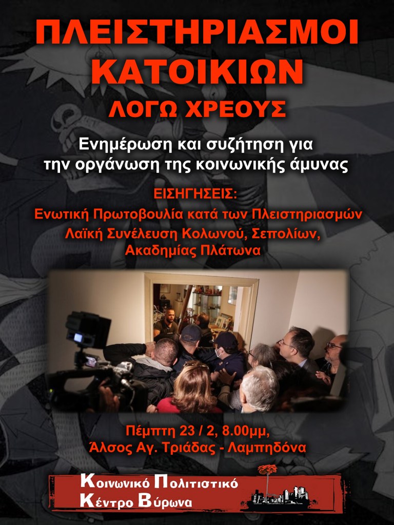 Πέμπτη 23 Φλεβάρη – Πλειστηριασμοί κατοικιών λόγω χρέους: Ενημέρωση/συζήτηση στον Βύρωνα για την οργάνωση της κοινωνικής άμυνας