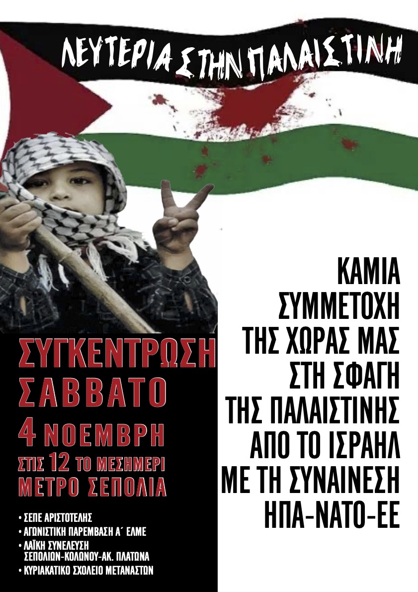 Το αντιπολεμικό κίνημα,οι εργαζόμενοι,τα σωματεία σε όλο τον κόσμο και στη χώρα μας έχουν βγει στους δρόμους και έμπρακτα δείχνουν την αλληλεγγύη τους, για να σταματήσουμε την σφαγή, στηρίζοντας τον αγώνα του παλαιστινιακού λαού για να ζουν στον τόπο τους λεύτεροι χωρίς κατοχή. Οι συλλογικότητες και φορείς που συνυπογράφουμε το κάλεσμα, πιστεύουμε ότι πρέπει να εκφραστεί σε κάθε γειτονιά,σε κάθε τόπο δουλειάς η αλληλεγγύη στον παλαιστινιακό λαό. Είναι σημαντικό να απαιτήσουμε να σταματήσει η ενεργή συμμετοχή του ελληνικού κράτους στο πλευρό του ιμπεριαλιστικού άξονα ΗΠΑ,ΝΑΤΟ,ΕΕ, που στηρίζουν το κράτος του Ισραήλ που μακελεύει τον παλαιστινιακό λαό.