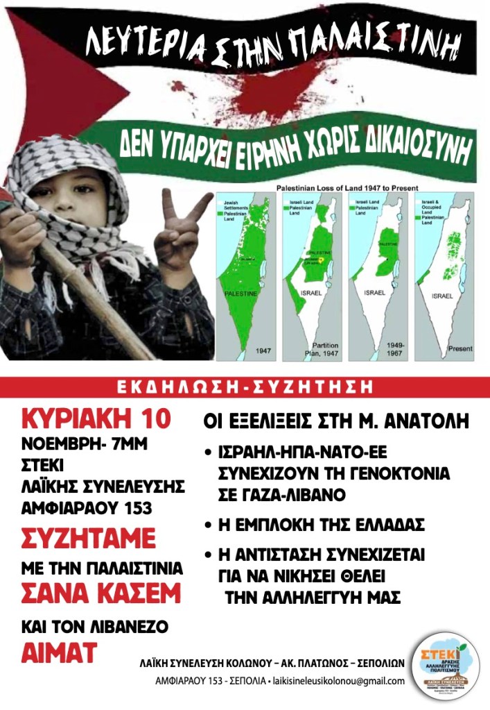 Εδώ και έναν χρόνο από τον Οκτώβρη του 2023, συνεχίζεται αμείωτα η γενοκτονία του Παλαιστινιακού λαού! Το κράτος δολοφόνος του Ισραήλ δεν έχει πρόθεση να σταματήσει το έγκλημα διαρκείας που διαπράττει κατά των Παλαιστινίων και του λιβανέζικου λαού. Η δολοφονική πολιτική του Ισραήλ, μετρά ήδη 43300 νεκρούς και 102000 τραυματίες οι περισσότερες/οι άμαχοι παιδιά και γυναίκες, στηρίζεται έμπρακτα από τις ΗΠΑ και το ΝΑΤΟ.