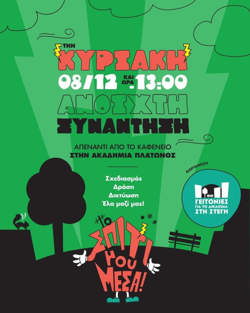 Tην Κυριακή 08.12.2024 θα βρεθούμε στην στην Ακαδημία Πλάτωνος για να μιλήσουμε για το δικαίωμα στη στέγη και τους ελεύθερους χώρους ! Σας περιμένουμε στη 1μμ απέναντι από το Καφενείο στην Ακαδημία Πλάτωνος ! (Μοναστηριου 140). Την παρέμβαση θα στηρίξουν με την παρουσία τους η Λαϊκή Συνελευση Κολωνου-Σεπολιων-Ακαδημιας Πλατωνα,Πρωτοβουλία Αγώνα για το Πάρκο της Ακαδημίας Πλάτωνα.