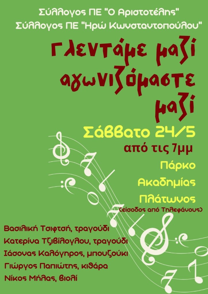 Σήμερα 24 Μάη σωματεία της εκπαίδευσης διοργανώνουν γλέντι οικονομικής ενίσχυσης στο πάρκο της Ακαδημίας Πλάτωνα.