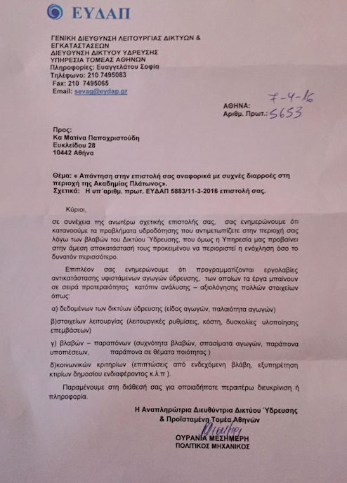Οι αναγνώστες του blog της Ακαδημίας Πλάτωνα θα θυμούνται την παρέμβαση της Επιτροπής Κατοίκων προς την ΕΥΔΑΠ, μετά τη μεγάλη βλάβη στην περιοχή της Ακαδημίας Πλάτωνα, όταν η γειτονιά έμεινε χωρίς νερό επί ένα ολόκληρο Σαββατοκύριακο. Συνεχίστε νὰ διαβάζετε “Η ΕΥΔΑΠ δέχεται ευχαρίστως …τα παράπονά μας”