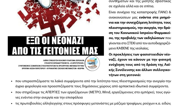 Στην έκτακτη μάζωξη την Τετάρτη  της Λαϊκής Συνέλευσης ΑΠΟΦΑΣΙΣΤΗΚΑΝ Το Σάββατο  4/3 10.30 το πρωί να γίνει καταγγελία στο αστυνομικό τμήμα Κολωνού, και μετά στις 12.30  στο μετρό Σεπόλια εξόρμηση-ενημέρωση της γειτονιάς Καλούμε την Δευτέρα 6/3 στις 7μμ στο στέκι  ανοικτή συνέλευση και προσκαλούμε σωματεία, … Συνεχίστε νὰ διαβάζετε Καταγγελία στο Αστυνομικό Τμήμα του Κολωνού για τις προκλήσεις των Νεοναζί