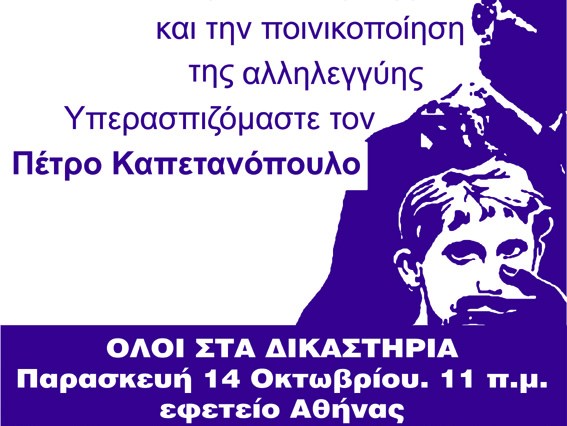 Με ομόφωνη γνώμη έδρας και εισαγγελέα εξέδωσε την αθώωση του Πέτρου Καπετανόπουλου το Μονομελές Εφετείο Αθηνών από όλες τις κατηγορίες.Ο Καπετανόπουλος αντιμετώπιζε κατηγορίες για αντίσταση κατά της αρχής, προσπάθεια ελευθέρωσης κρατουμένου και ψευδή ανωμοτί κατάθεση διότι διαμαρτυρήθηκε για τη βία … Συνεχίστε νὰ διαβάζετε Ομόφωνη απόφαση αθώωσης του Καπετανόπουλου