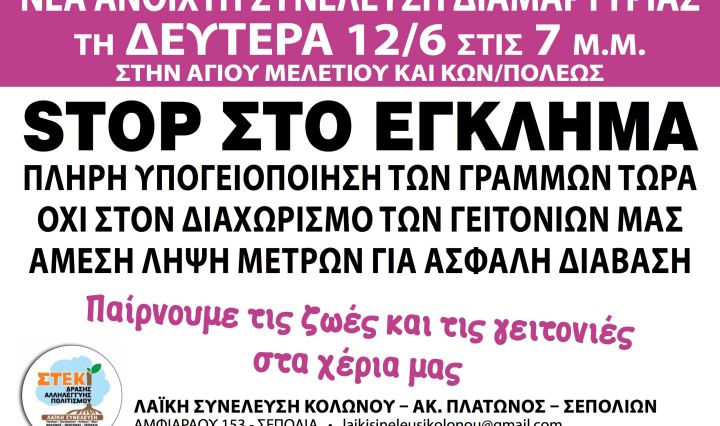 Τη Δευτέρα 6/6 εγινε κινητοποίηση-ανοικτή συνέλευση πάνω στις γραμμές του τραίνου,οπου πάνω απο μια ωρα που διήρκησε εκφράστηκε η αγανάκτηση για την συνεχιζόμενη υποβάθμιση της περιοχής με ευθύνη διαχρονικα ολων των κυβερνήσεων και της δημοτικής αρχής που δεν υλοποιουν το παγιο αιτημα των κατοίκων και φορέων της περιοχής για την υπογειοποίηση των γραμμών, και για τις τραγικές ελλείψεις των αφύλακτων διαβάσεων που ειχαν σαν αποτέλεσμα να εχουμε δυο θανάτους μέσα σε 4 μήνες στις γραμμές του τραινου.Κοινή θέληση ολων ηταν η συνέχιση των αγωνιστικών κινητοποιήσεων, ετσι αποφασίστηκαν