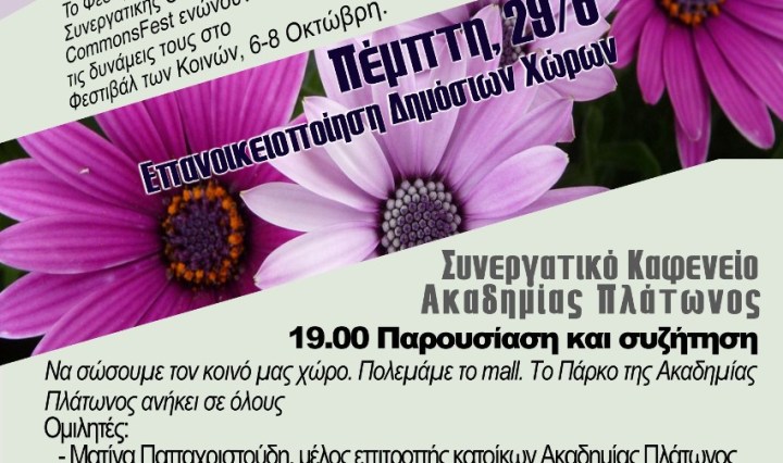 Την Πέμπτη 29/06, θα βρεθούμε στο Συνεργατικό Καφενείο Ακαδημίας Πλάτωνος (Μοναστηρίου 140) με σκοπό να ενημερωθούμε, να στηρίξουμε τους αγώνες για την επανοικειοποίηση των Δημόσιων Χώρων και να δείξουμε έμπρακτα την αλληλεγγύη μας στους αγώνες που δίνονται από τους κατοίκους για το Πάρκο στην Ακαδημία Πλάτωνος.