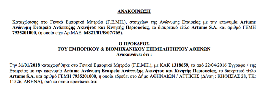Με απόσταση 21 μηνών ενημερώνει η Artume AE το ΓΕΜΗ για τη δραστηριότητά της. Το τελευταίο διάθεσιμο έγγραφο για απόφαση που ελήφθη στις 22 Απριλίου 2016, κατατέθηκε στις 31 Ιανουαρίου 2018. Συνεχίστε νὰ διαβάζετε “Για τη δραστηριότητα του 2015, η Artume ενημερώνει το 2018, κ. Σταθάκη…”